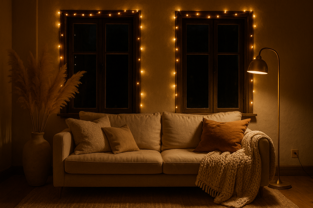 - Lichterkette „Warm White“ *(Amazon): Eine Lichterkette darf nicht fehlen, und Amazon bietet hier eine riesige Auswahl. Mein Favorit ist eine warmweiße Lichterkette mit kleinen LED-Lämpchen, gerne batteriebetrieben oder mit Fernbedienung für Timer-Funktion. Diese kannst du unglaublich vielseitig einsetzen: Hänge sie als Vorhang in dein Fenster, lege sie ins Regal zwischen Deko-Objekte oder wickle sie um das Kopfteil deines Bettes. Sofort entsteht ein magischer Lichterglanz, der den Raum in gemütliches Licht taucht. Gerade Vorhänge aus Licht* verleihen dem Schlafzimmer eine verträumte Note, während im Wohnzimmer eine Lichterkette am Fensterrahmen von draußen schon einladend wirkt. Achte auf warmweißes Licht (kein grelles Kaltweiß), damit die Atmosphäre behaglich bleibt.