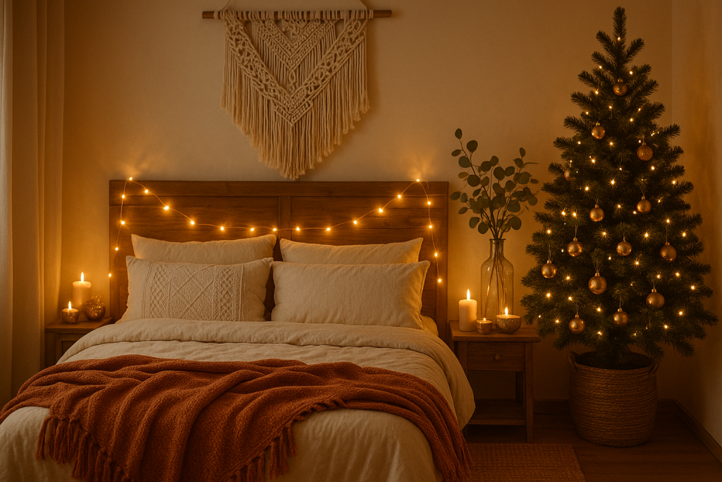 Ein weihnachtlich dekoriertes Wohnzimmer im Boho-Stil: Warme Lichter, natürliche Texturen und gemütliche Farben schaffen eine einladende Atmosphäre.