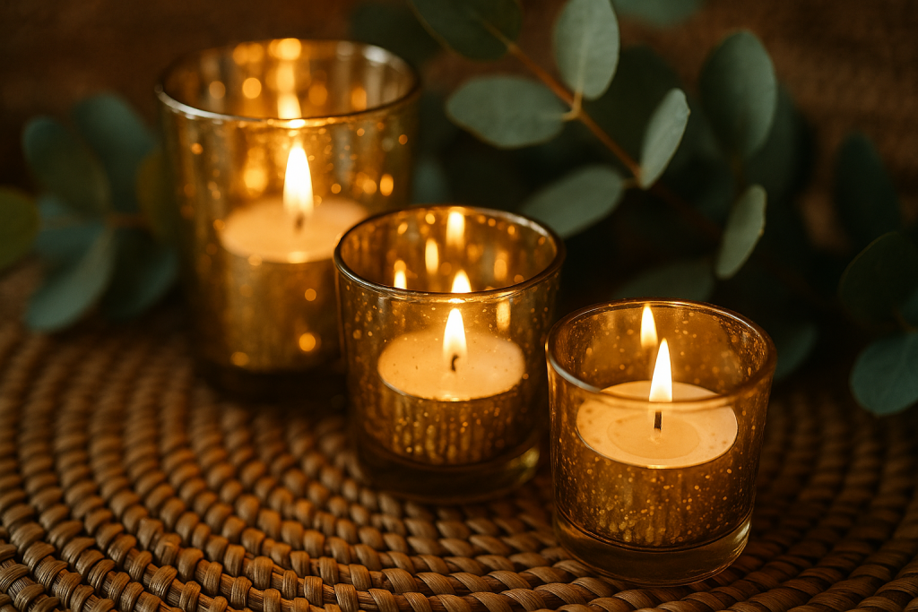 - Kerzen & Düfte gruppieren: Stelle mehrere Kerzen in verschiedenen Höhen zusammen, anstatt sie einzeln zu verteilen. Auf einem hübschen Tablett arrangiert (ggf. mit etwas Deko-Grün dazwischen) wirken Kerzen gleich noch stimmungsvoller. Verwende z.B. einen Mix aus Stumpenkerzen und Teelichthaltern in Gold oder Glas. Für den Boho-Touch können es auch Kerzen in Vintage-Gläsern oder Duftkerzen mit Holzdocht sein. Das flackernde Lichtbündel schafft am Abend eine Oase der Ruhe. Bonus-Tipp: Wähle Duftkerzen mit natürlichen Aromen wie Zimt, Vanille oder Tannennadel – so sprichst du alle Sinne an und unterstreichst die festliche Stimmung.