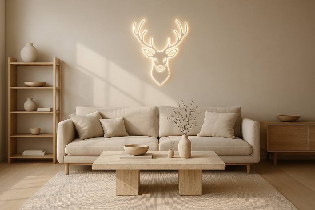 Abbildung: Japandi-Couchtisch aus beigem Travertin und schlichter Holzoptik, kombiniert mit einer LED-Wanddeko im Hirsch-Design. Die Materialien und Formen vermitteln schlichte Eleganz und eine ruhige, wohnliche Atmosphäre.