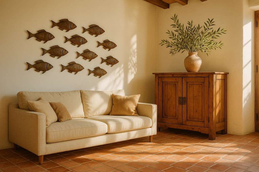 Abbildung: Mediterranes Wanddekor in Fischform – die metallisch-grauen Fische bringen maritimen Charme an die Wand. Ergänzt wird der Look durch rustikales Holz und warme, erdige Töne (Schrank nicht abgebildet).