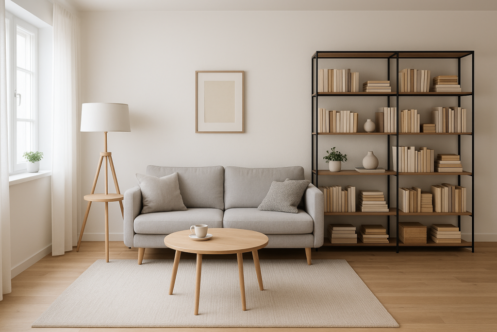 Skandinavischer Stil (Scandi): Skandinavisches Design steht für Helligkeit, Funktionalität und Gemütlichkeit. Typisch sind helle Holzarten, Weiß- und Grautöne und ein aufgeräumtes Ambiente. Ein offenes Bücherregal aus hellem Holz und schwarzem Metallrahmen wirkt leicht und luftig – ideal für Bücher, Deko und Pflanzen ohne Unordnung.