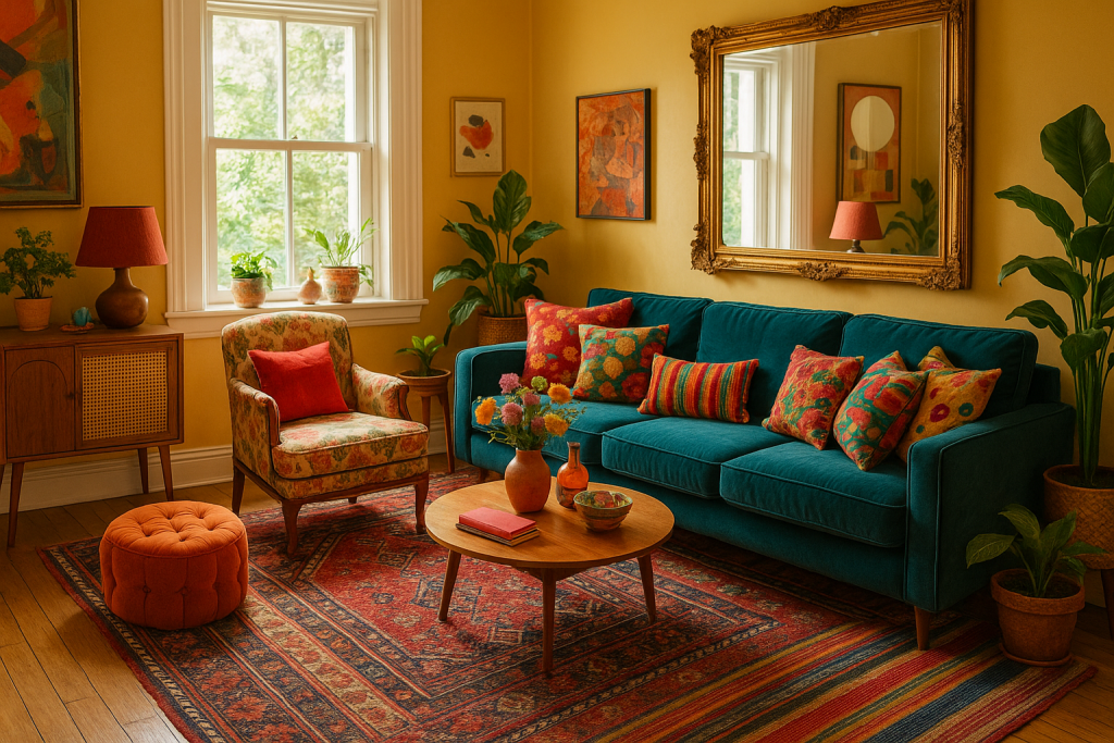 Maximalismus lebt von mutigen Kombinationen. Ein Samtsofa in Smaragdgrün, daneben ein goldener Beistelltisch und ein Kelimteppich mit Fransen – klingt wild? Genau das ist der Punkt.